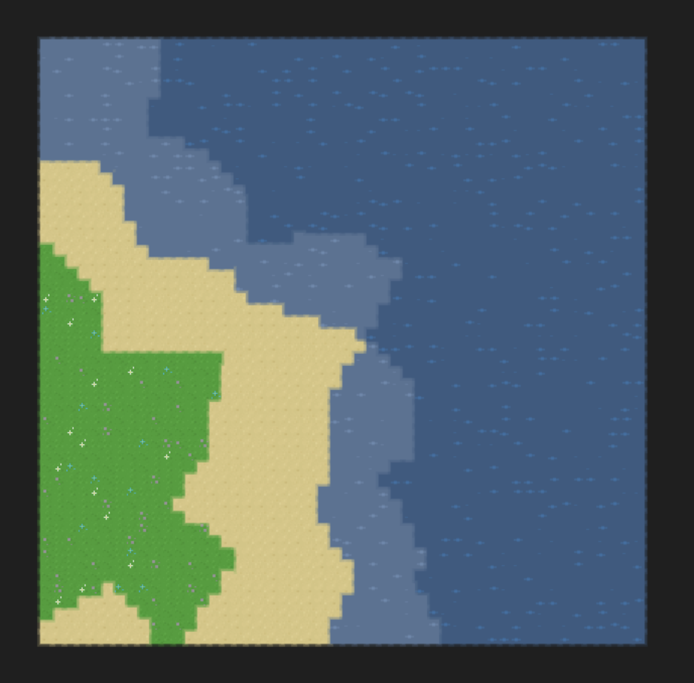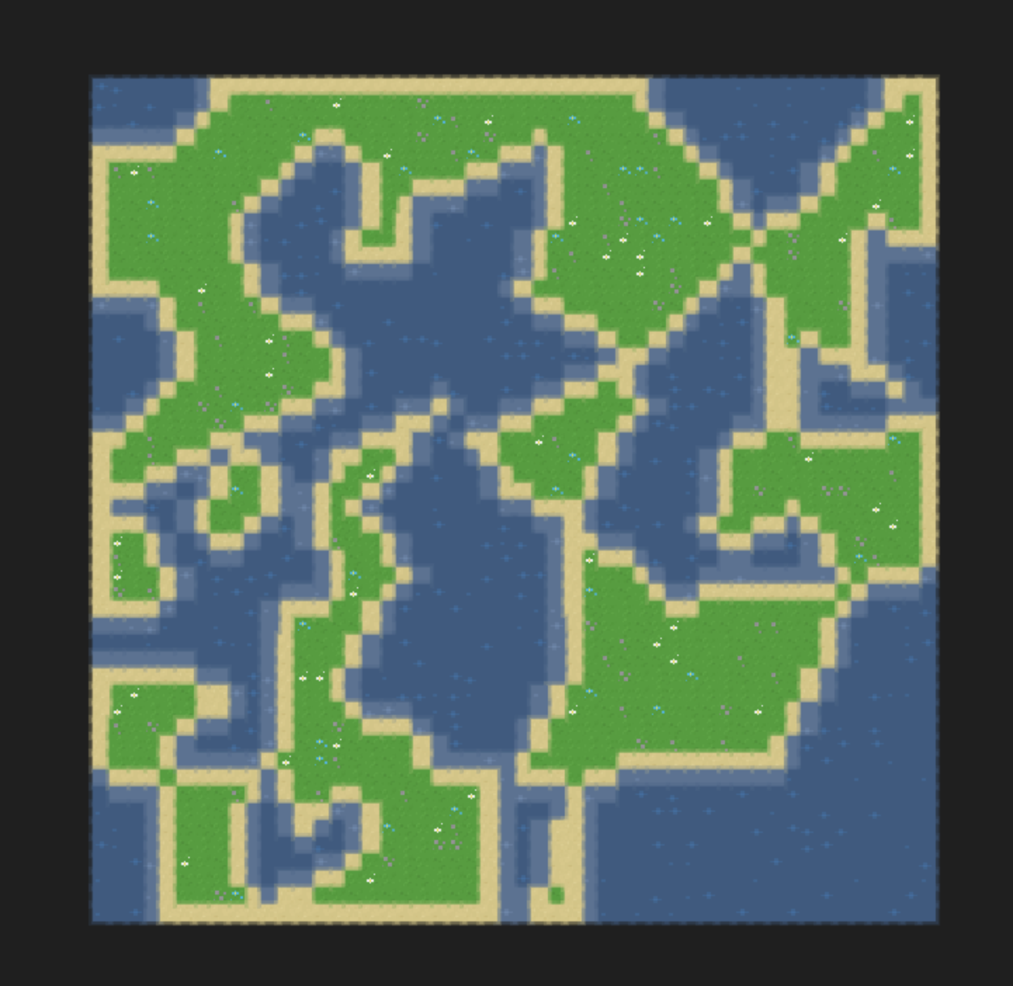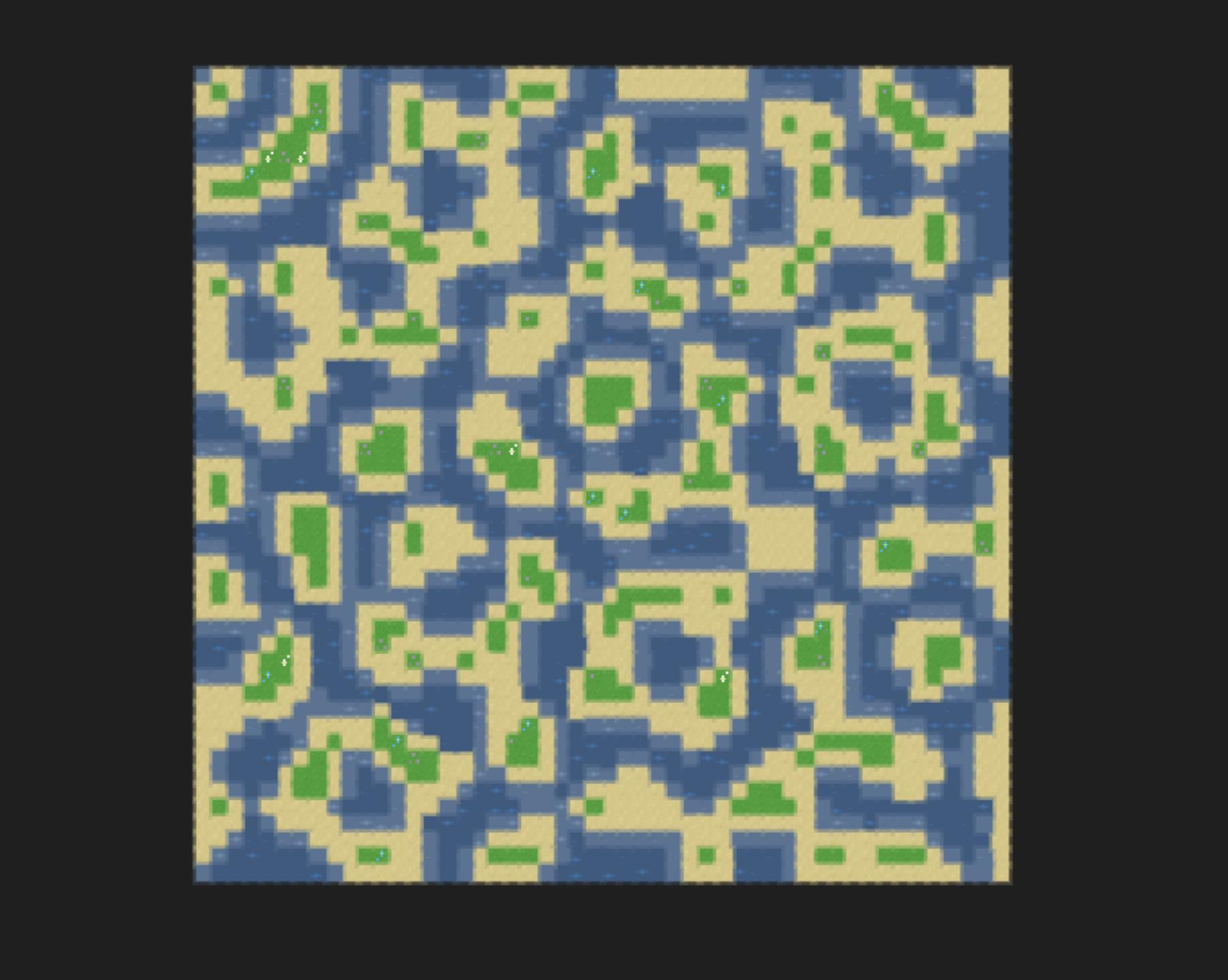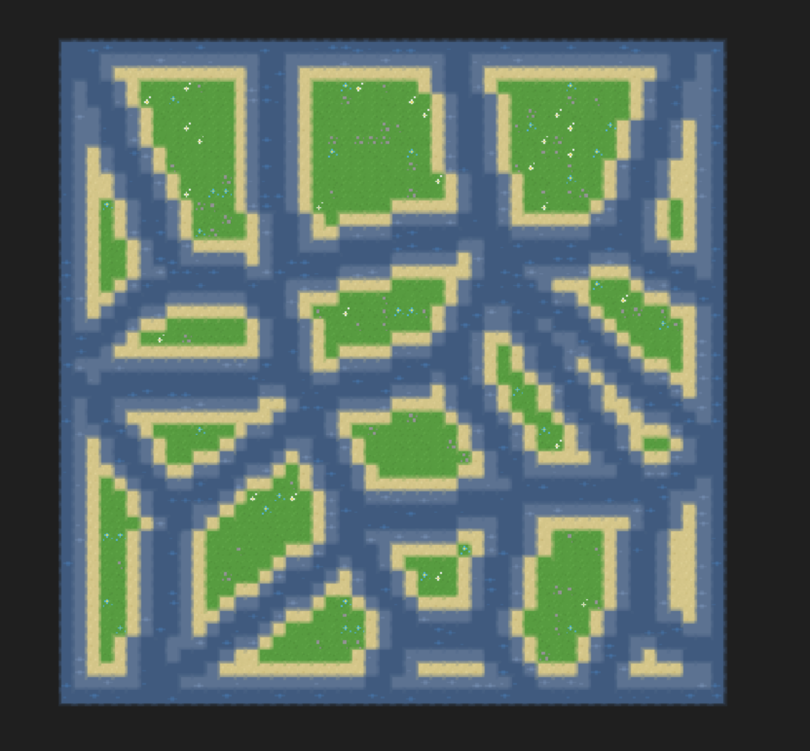 Next, make bigger chunks of island with less water distance between them. Lets just fill each cell with grass, then border it in water and apply a border of sand to the grass.