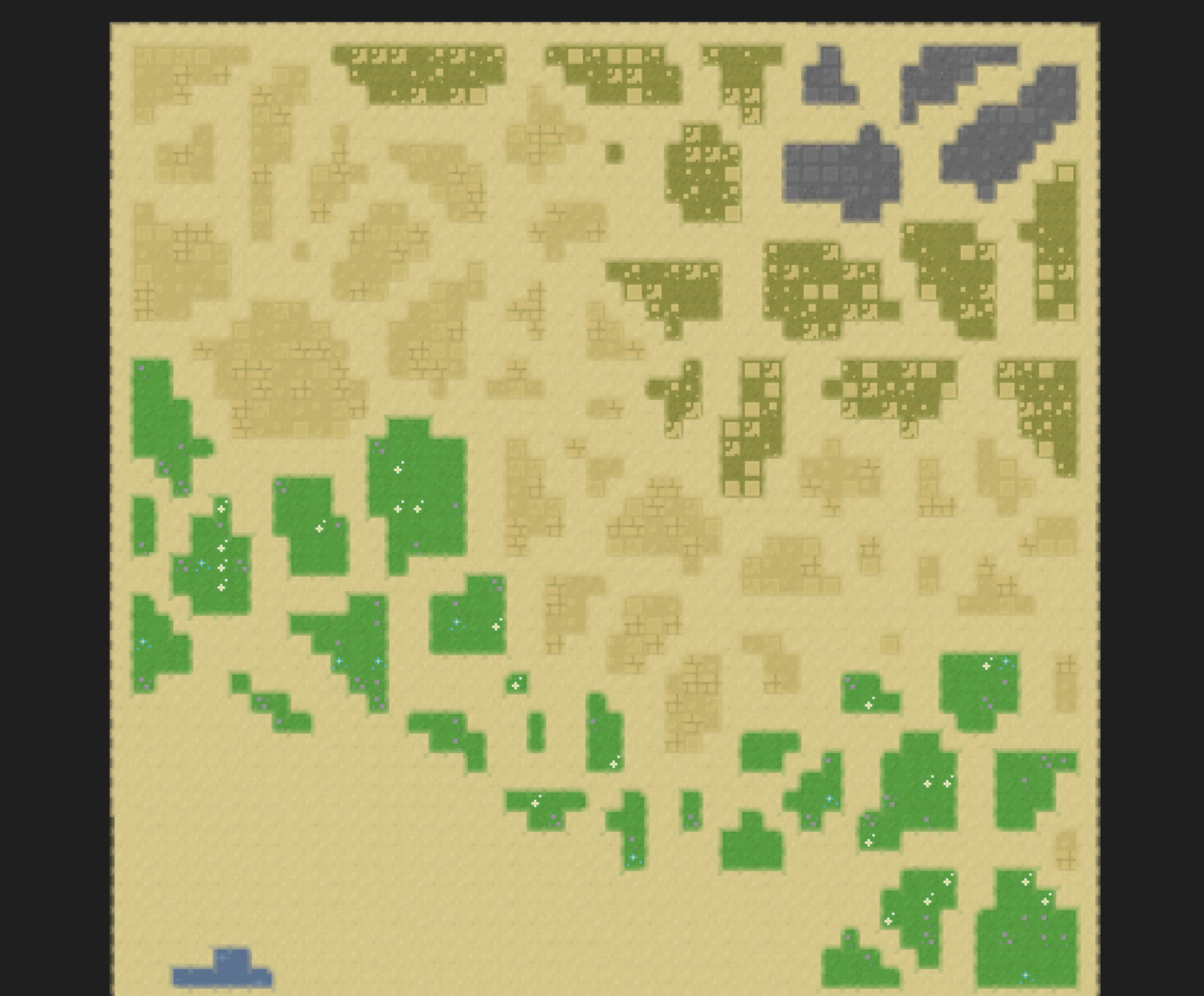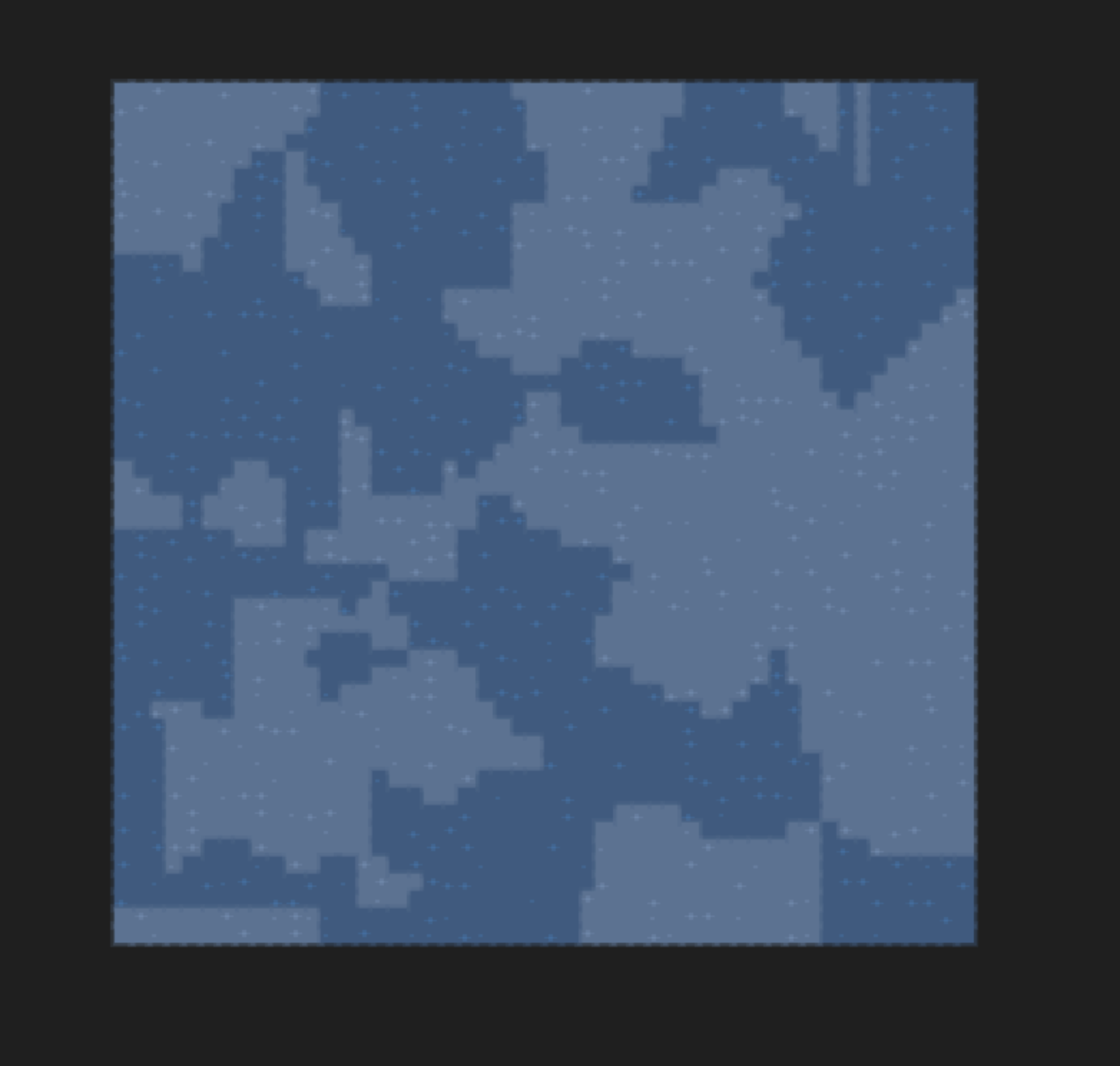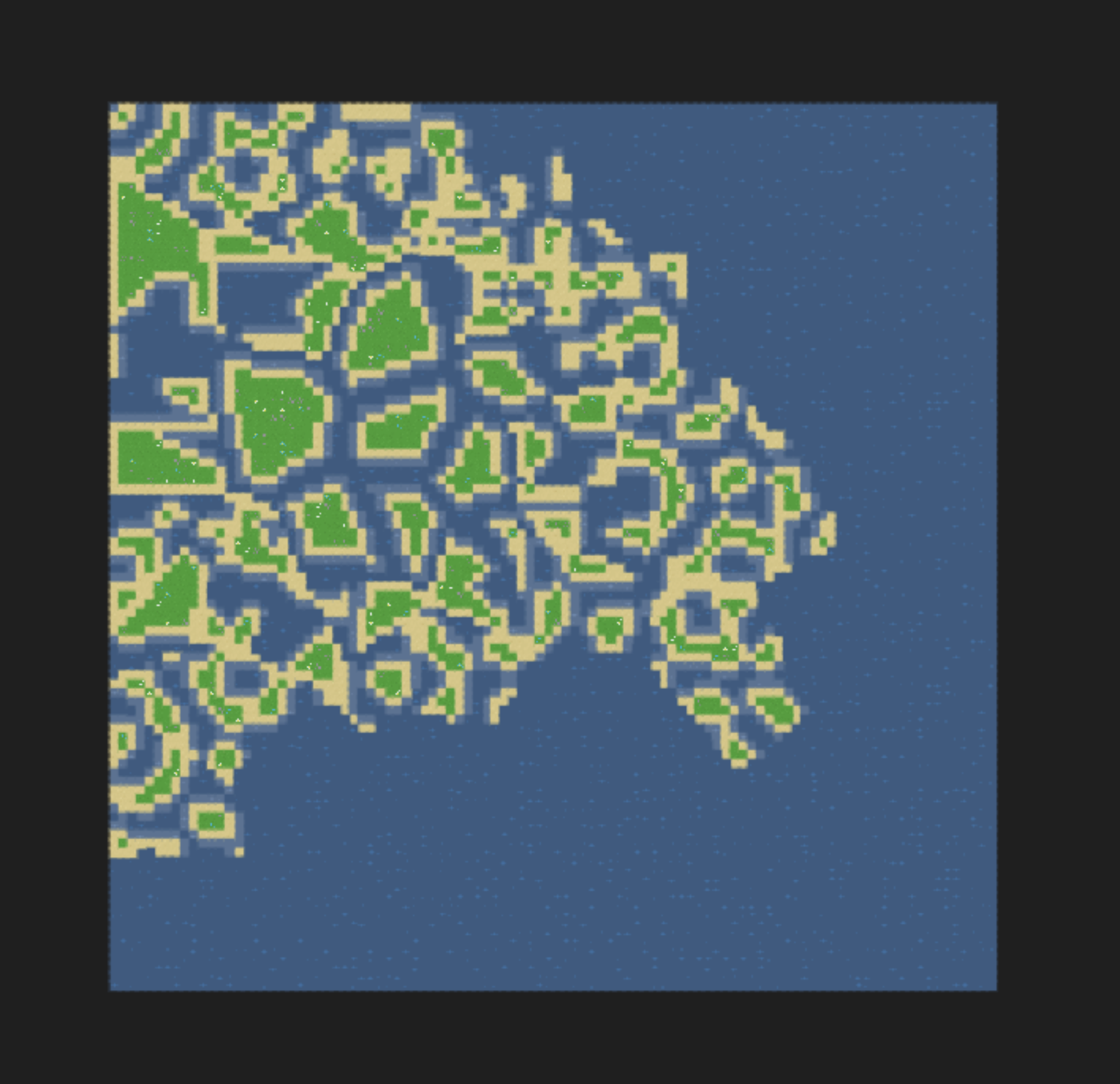 The final step is actually applying these biomes. While you could just apply a biome manually to a cell by invoking each modifier in it, that wouldn't be very fun. It also wouldn't generate anything cool. I opted to implement a spreading effect, where it selects a cell from your world at random as a "patient-0" and given a list of biomes propogates through your world applying biomes based on the distance of a cell from patient-0.