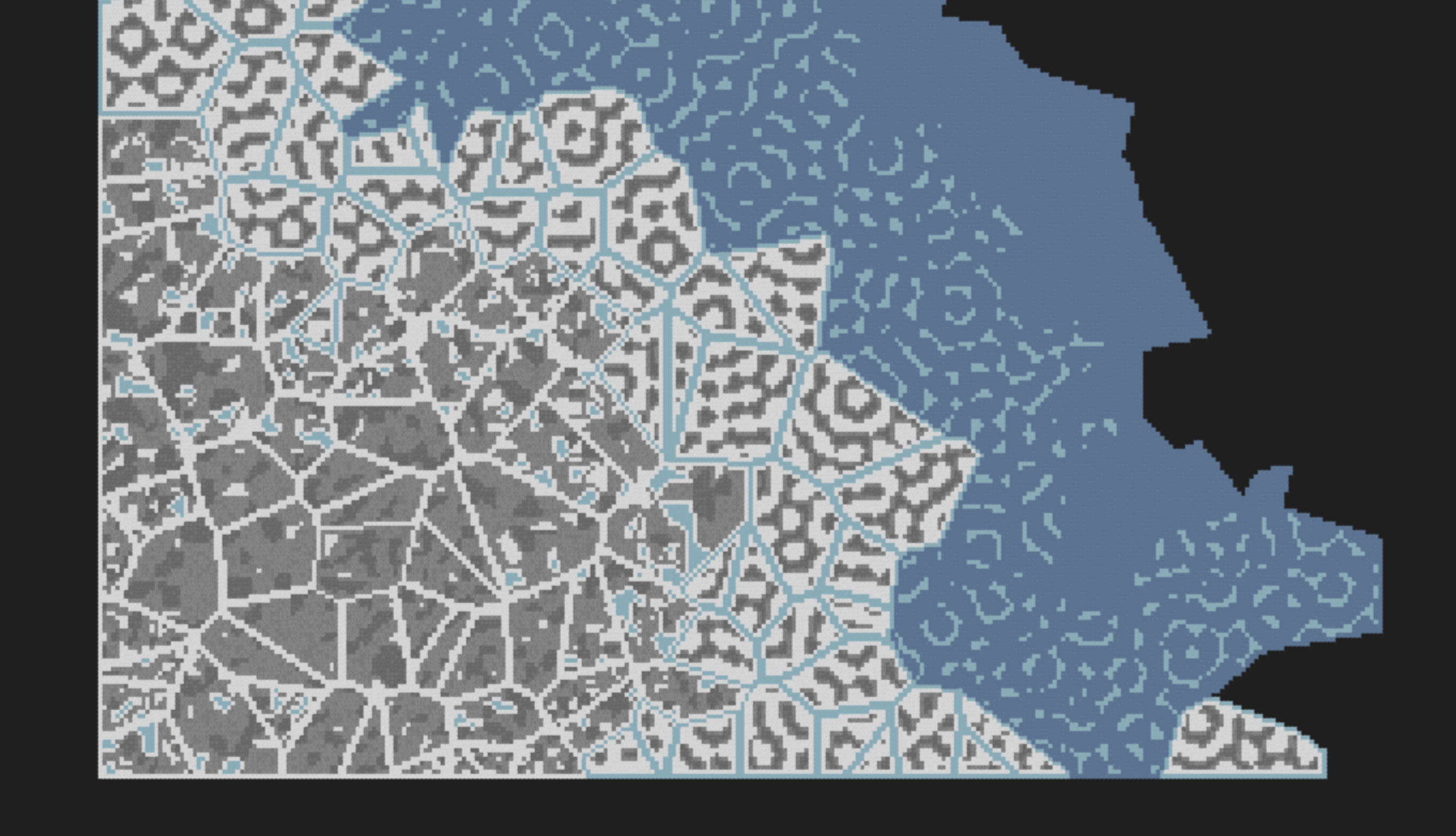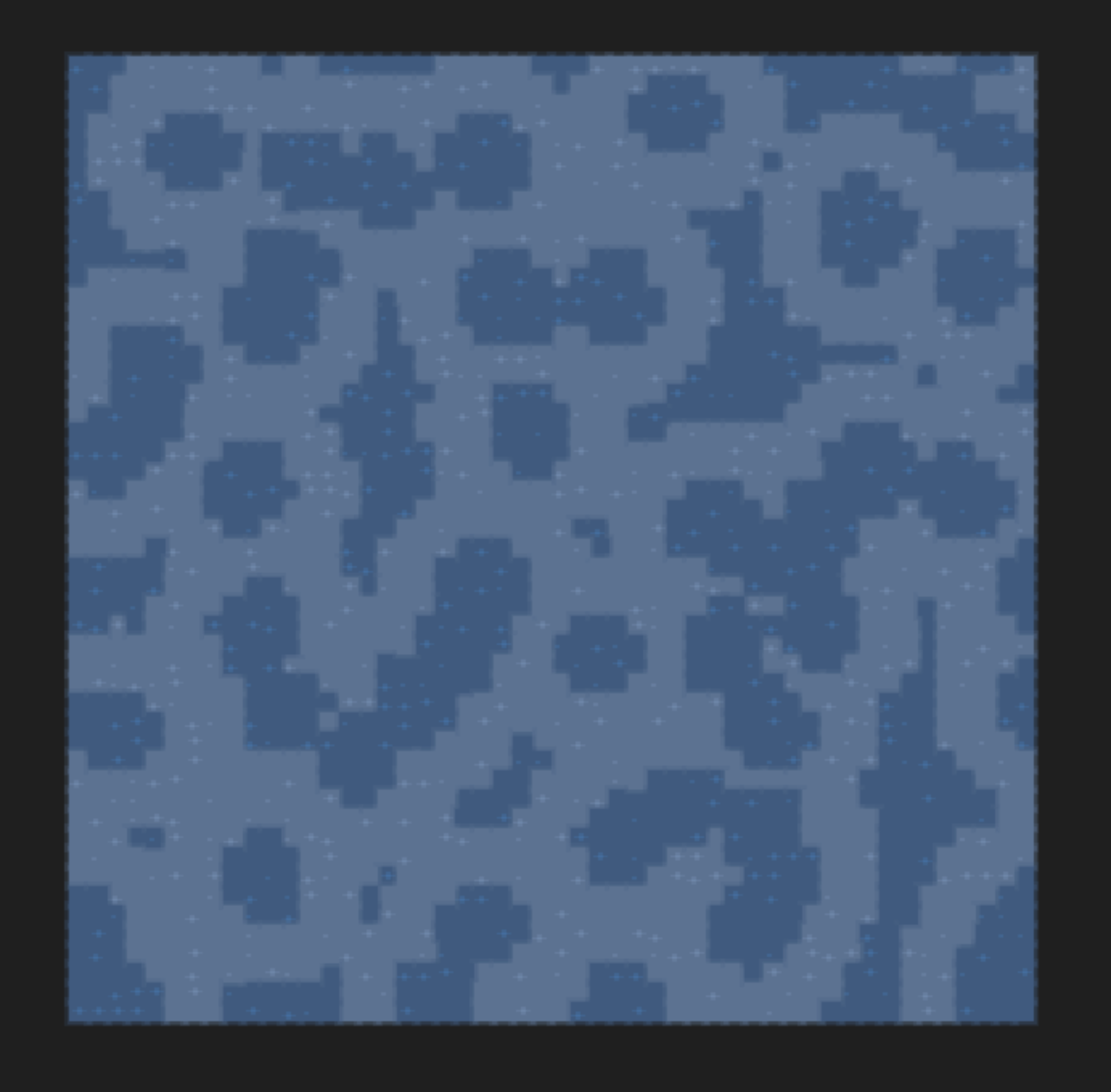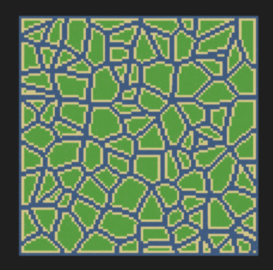 Finally, we can make some more chaotic sandbars using the pattern modifier. We generate a pattern of grass and water, then apply selective borders same as before. We utilize the
